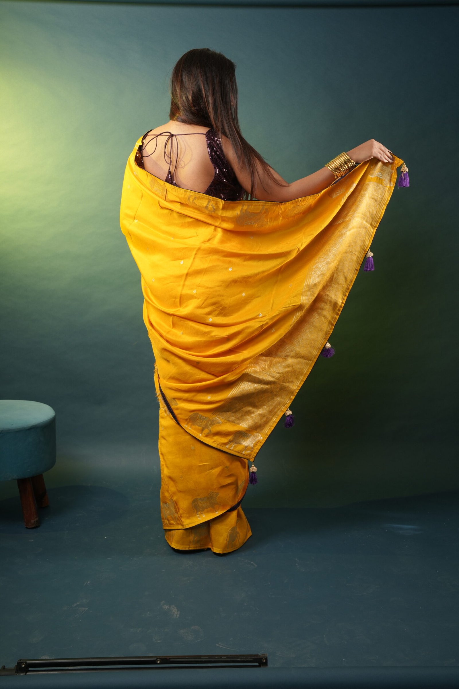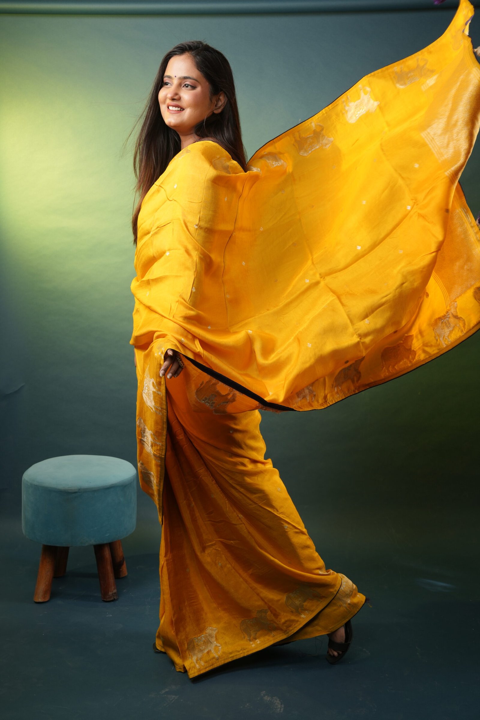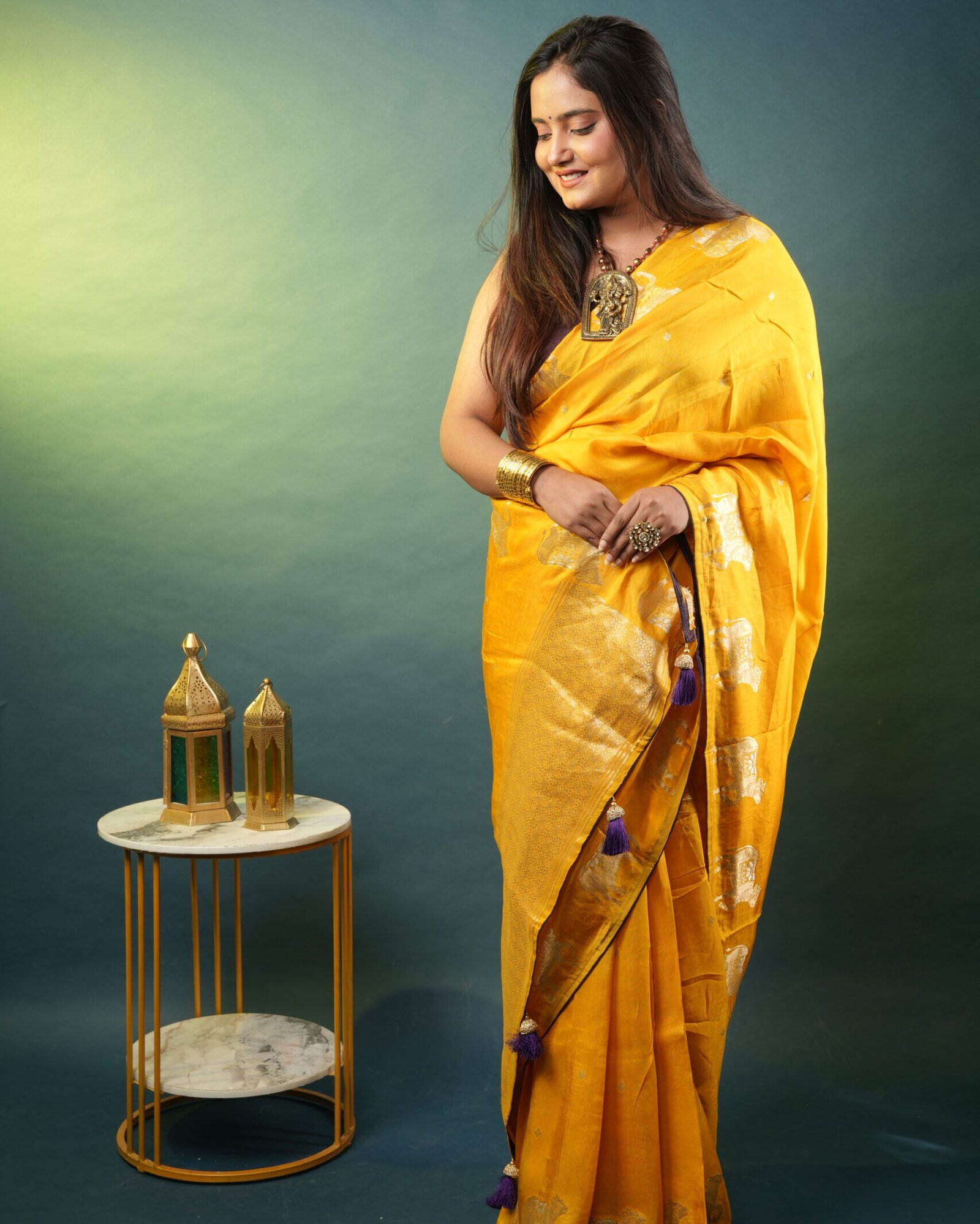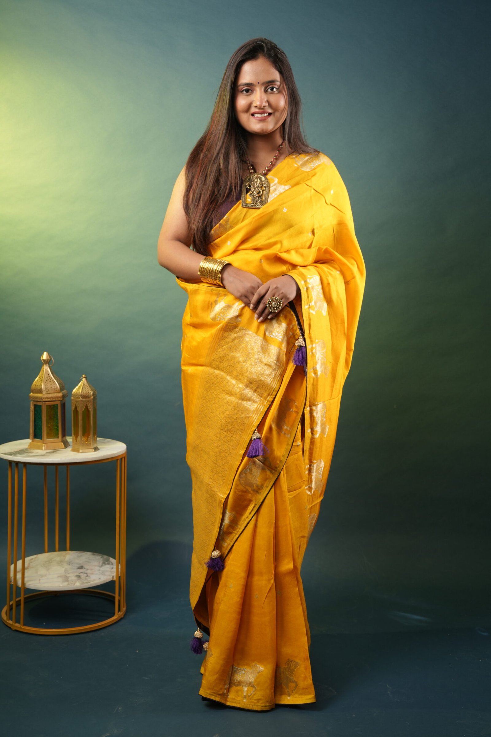 Brighten any occasion with this luminous crepe silk saree. The vibrant, sunshine yellow body flows beautifully, offering a lightweight and comfortable drape. The saree is elevated by a broad, shimmering gold zari pallu, which adds a touch of festive grandeur.
