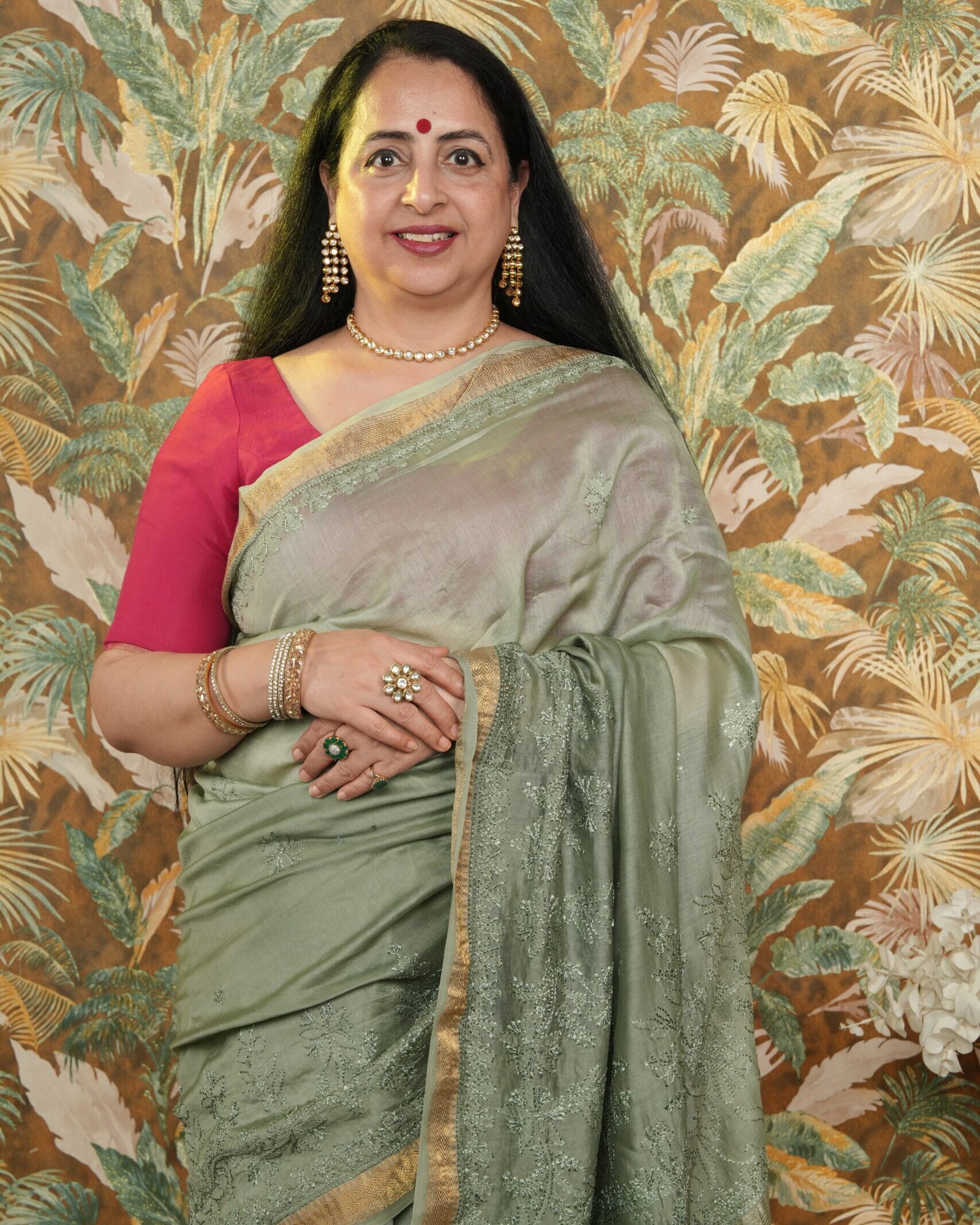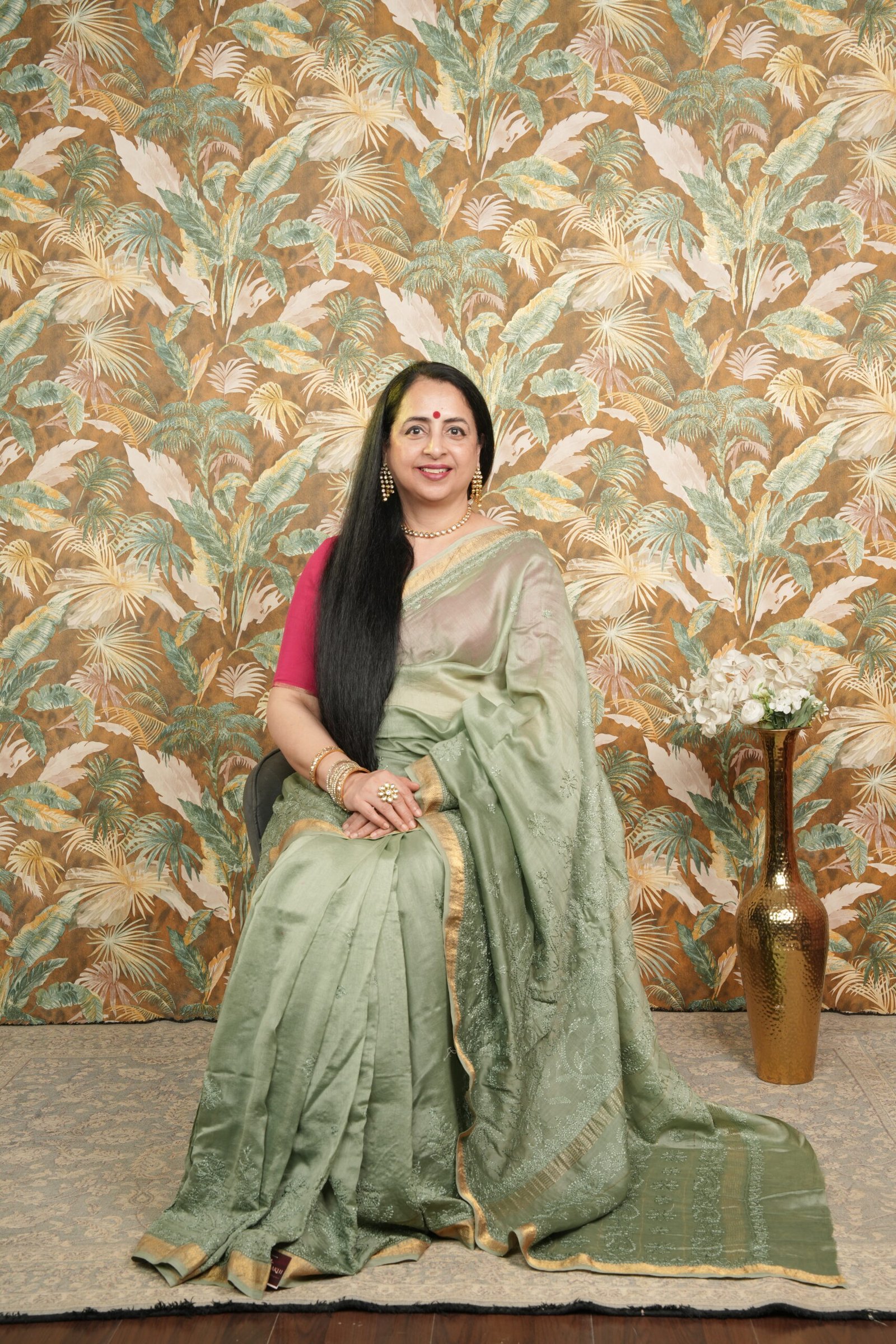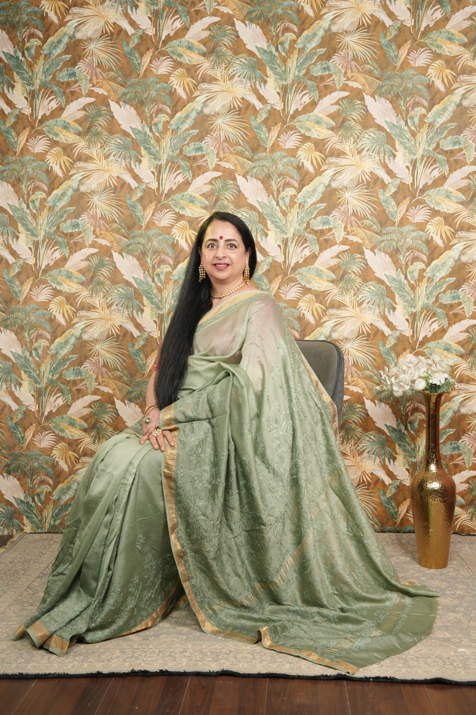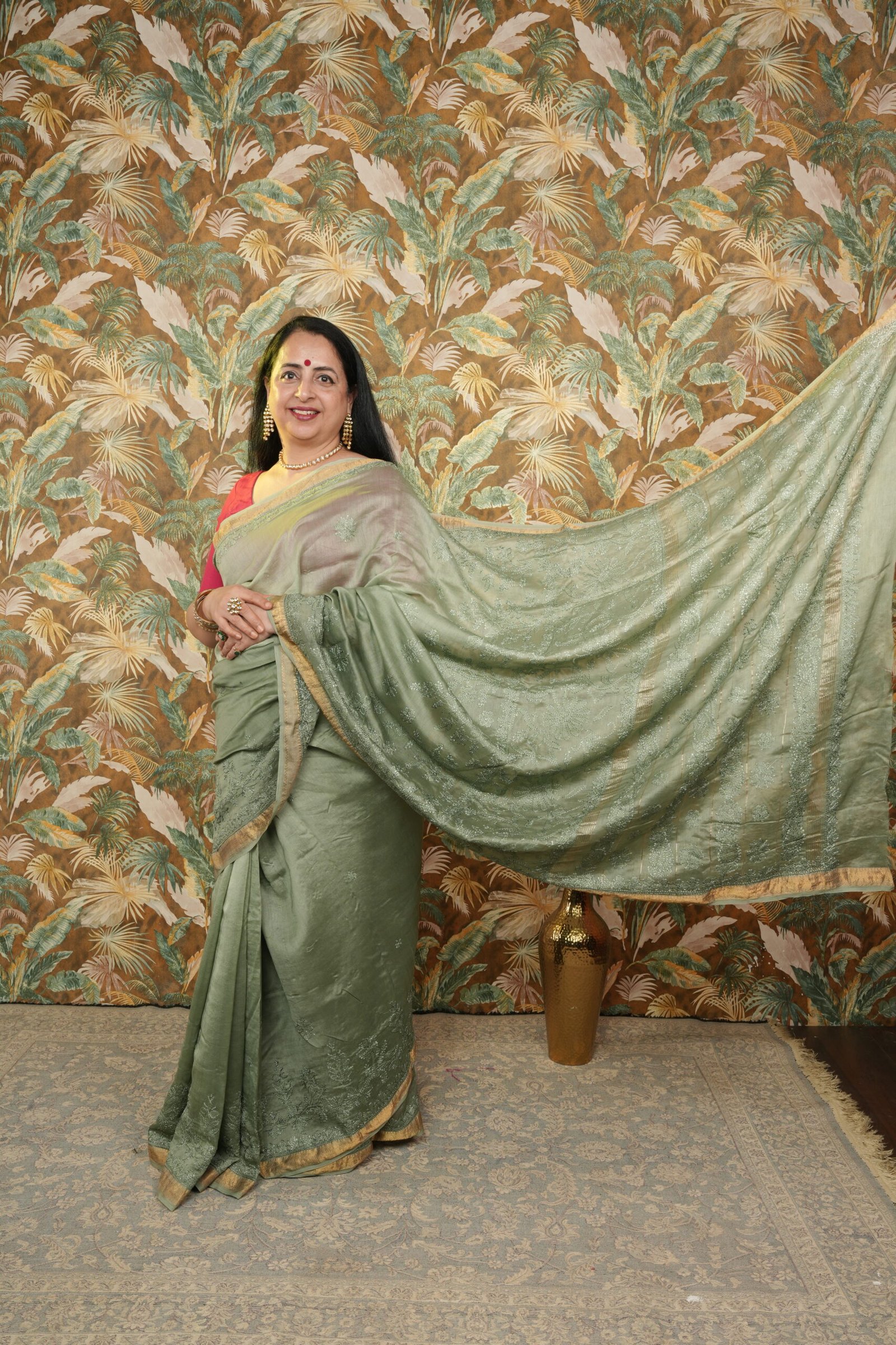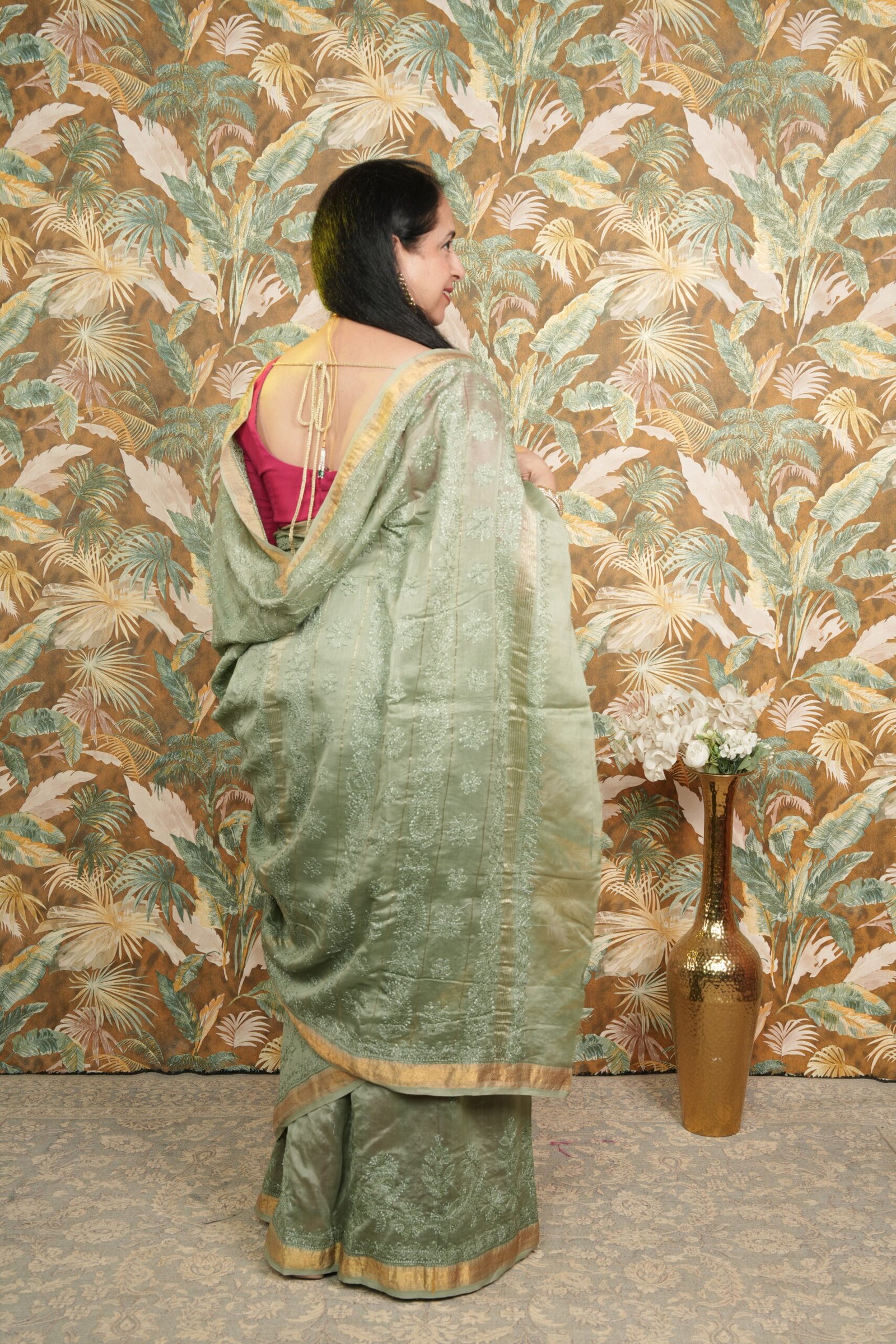 Discover the essence of grace with this classic Chanderi saree. Its lightweight, airy body in a sophisticated sage green is adorned with intricate, all-over Lucknowi Chikankari. A traditional gold zari border adds a timeless, elegant contrast.