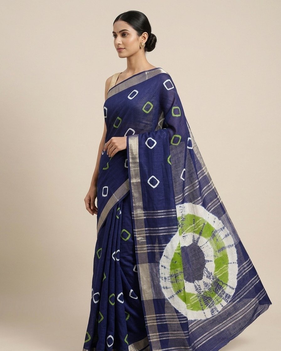 Make a bold yet elegant statement with this stunning Mulmul Cotton Saree, featuring a deep indigo base highlighted with modern geometric motifs in white and lime green. The striking circular tie-dye inspired pallu adds a unique artistic touch to the overall design.
