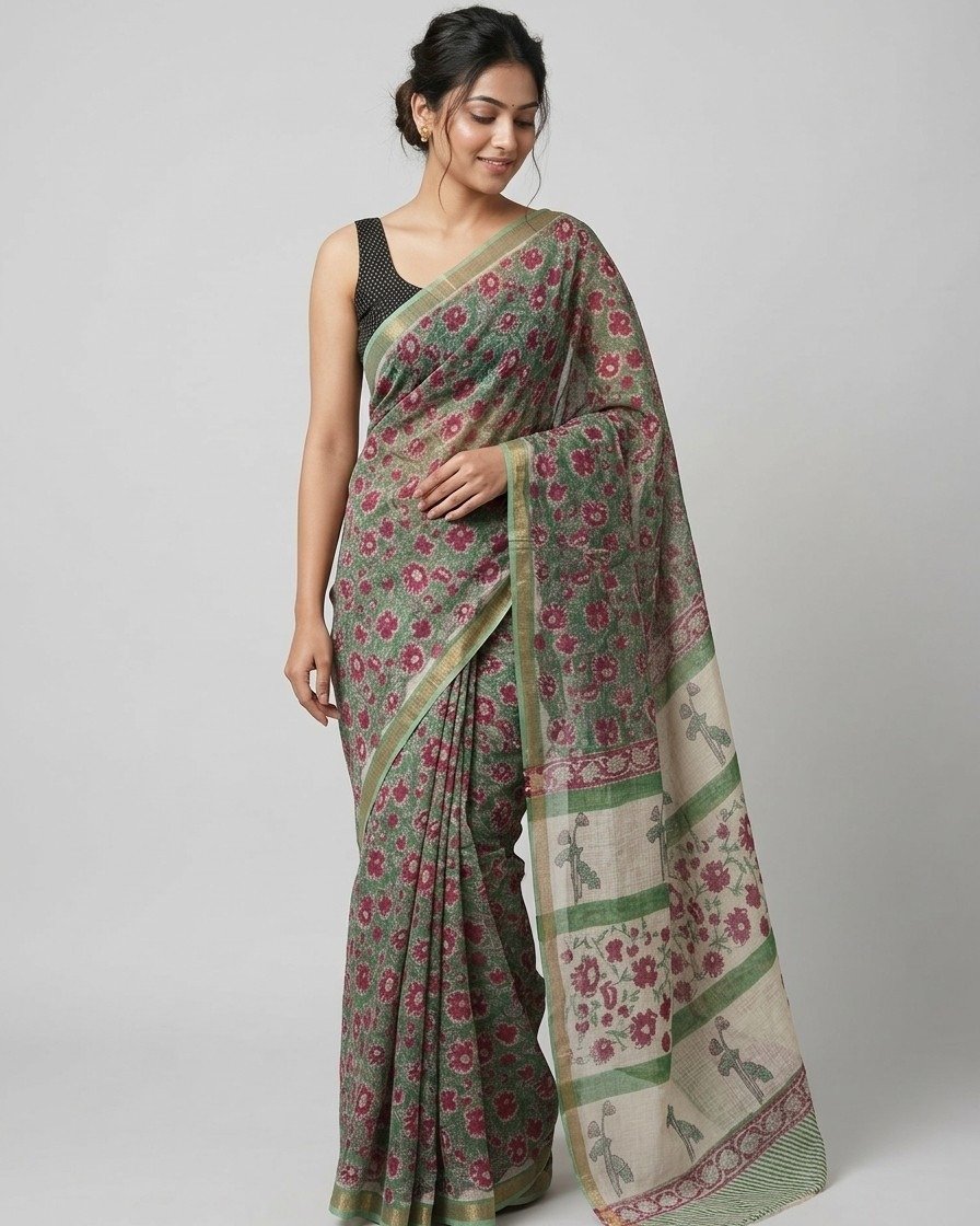 Embrace effortless grace with this beautifully woven Kota Doriya Saree, featuring a refreshing blend of soft green hues adorned with delicate floral motifs. The design brings together a serene, nature-inspired aesthetic that feels both timeless and contemporary.