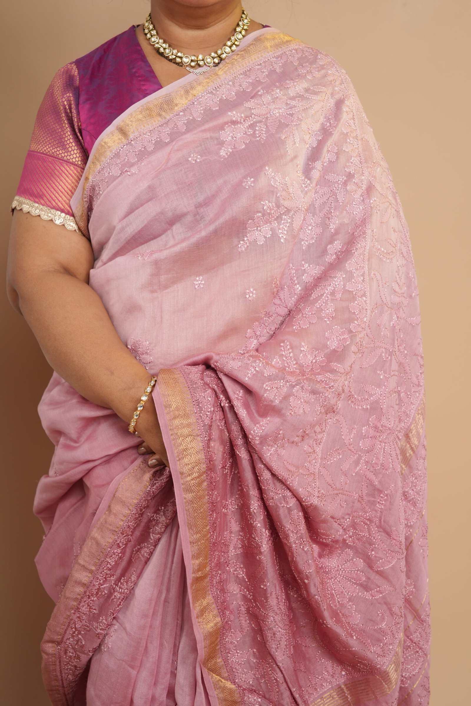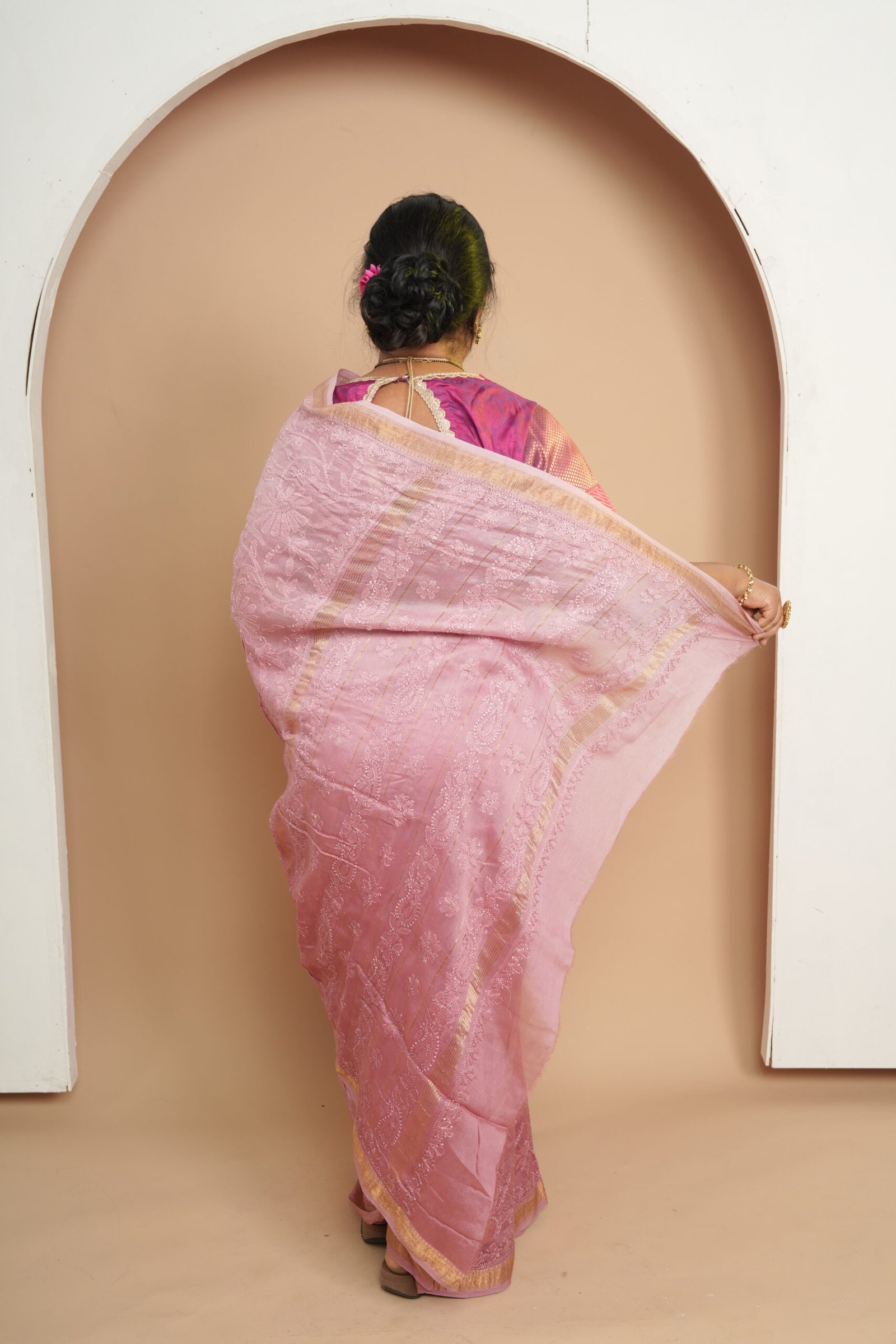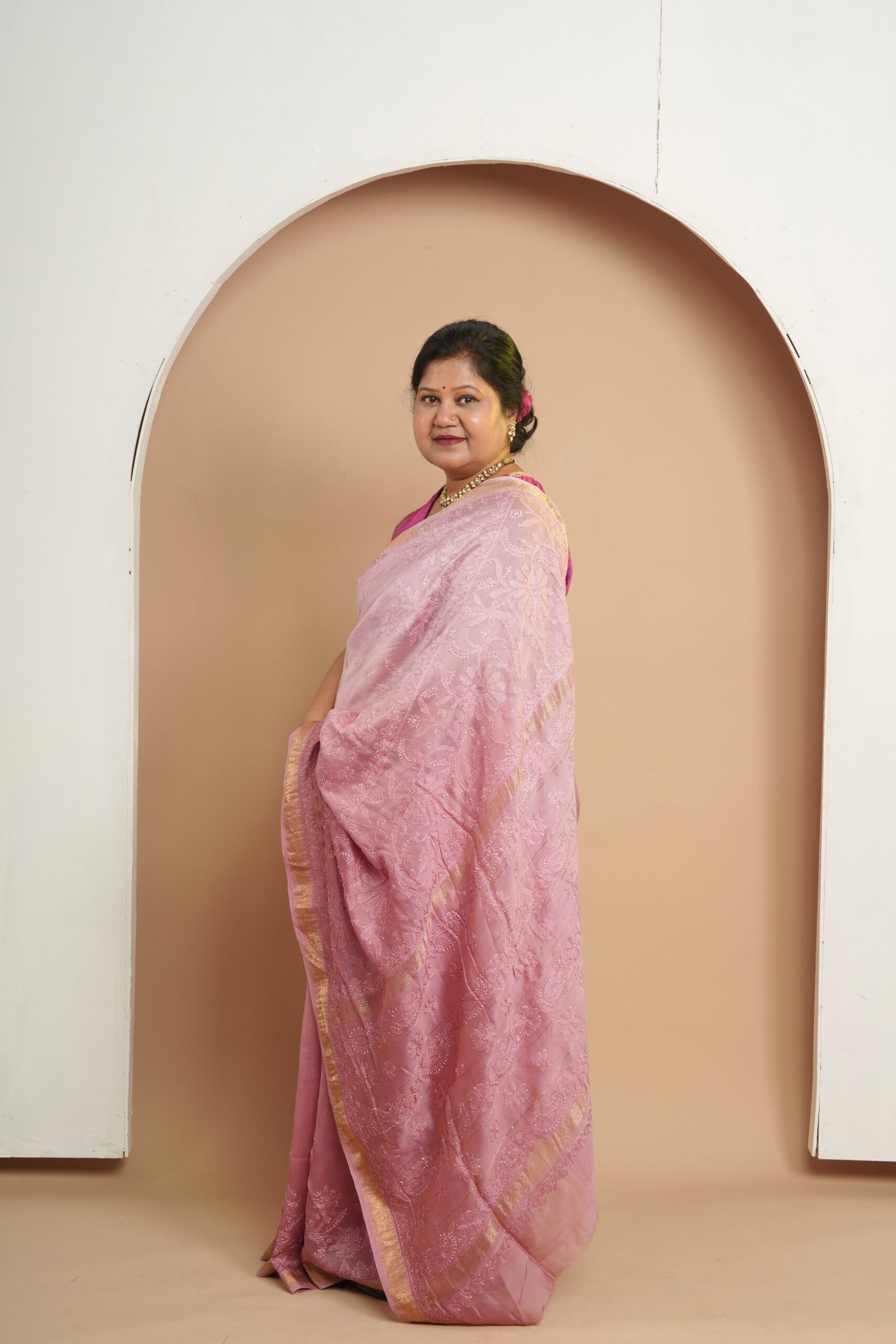 Experience timeless elegance with this beautiful Chanderi saree. It combines the airy, lightweight feel of Chanderi with the intricate, hand-embroidered grace of authentic Lucknowi Chikankari. A classic gold zari border adds a touch of subtle grandeur.