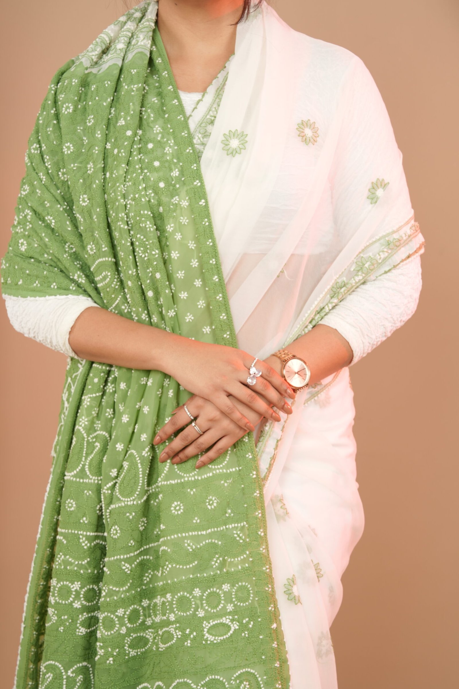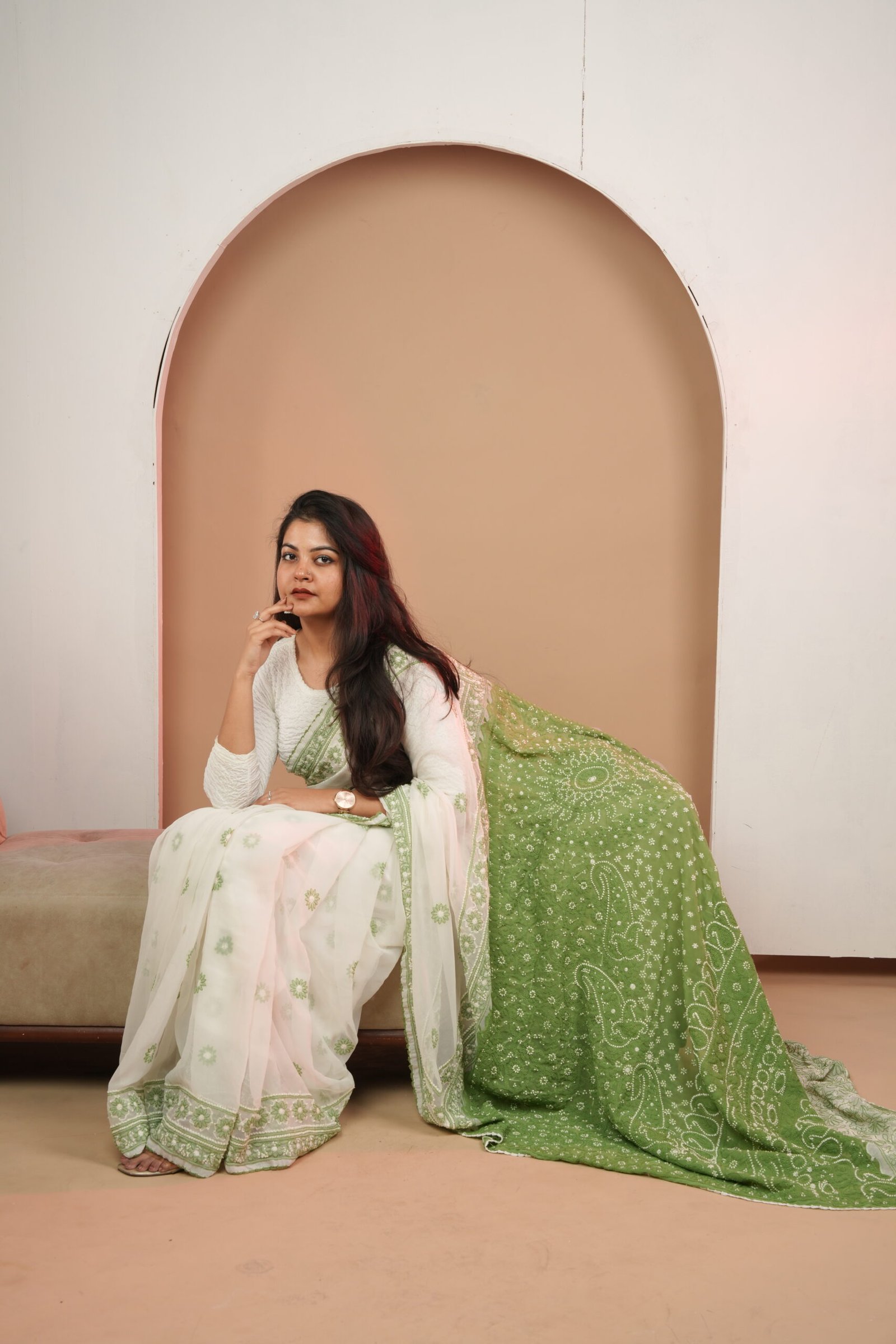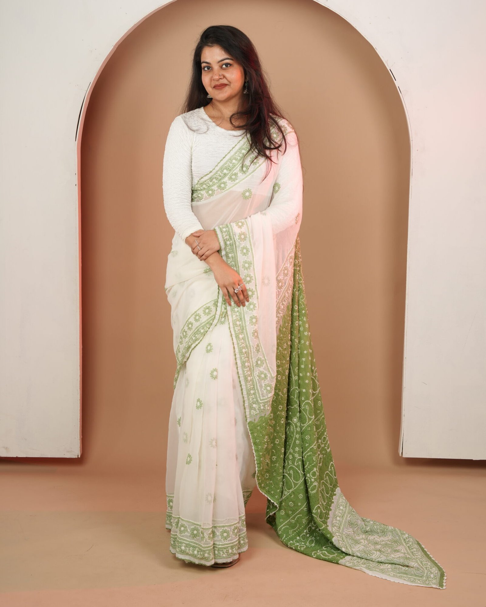 Make a stunning, elegant statement with this Lucknowi Chikankari saree. It features a beautiful dual-tone design, combining a classic off-white body with a rich, olive green pallu. The entire saree is adorned with intricate, all-over Chikankari embroidery.