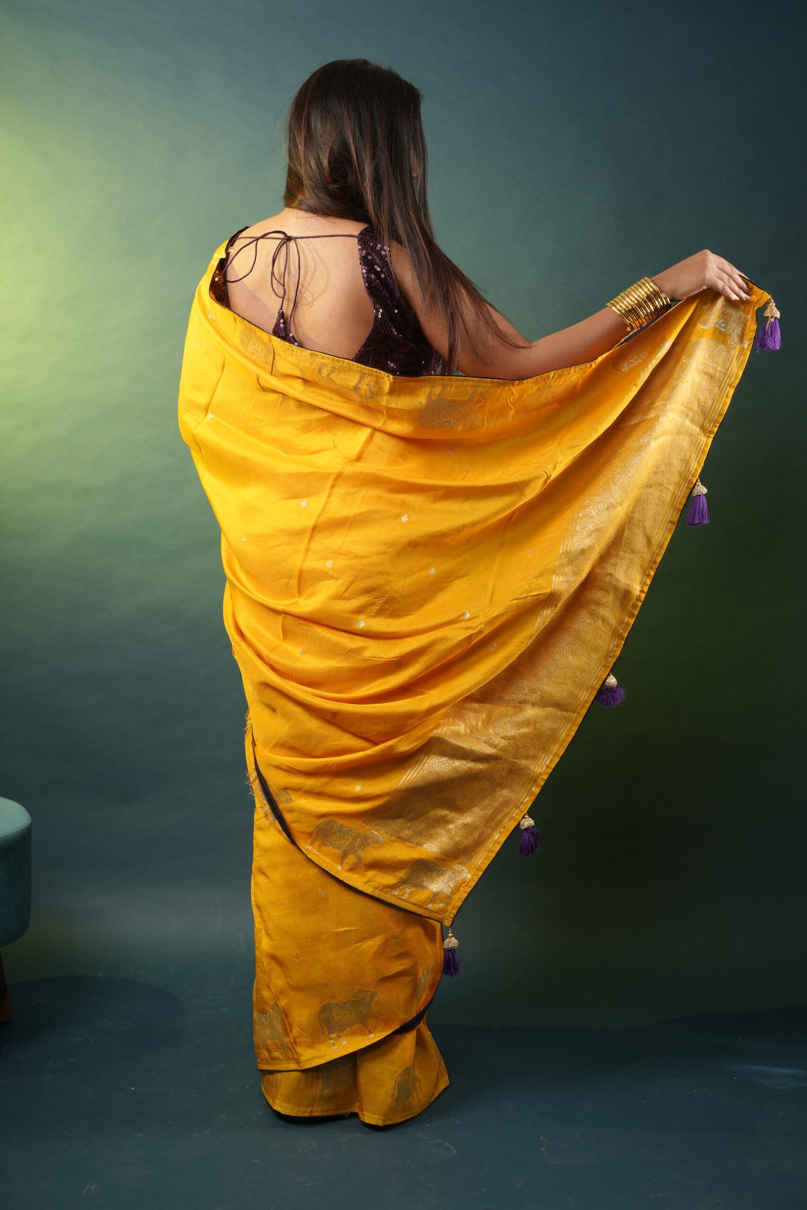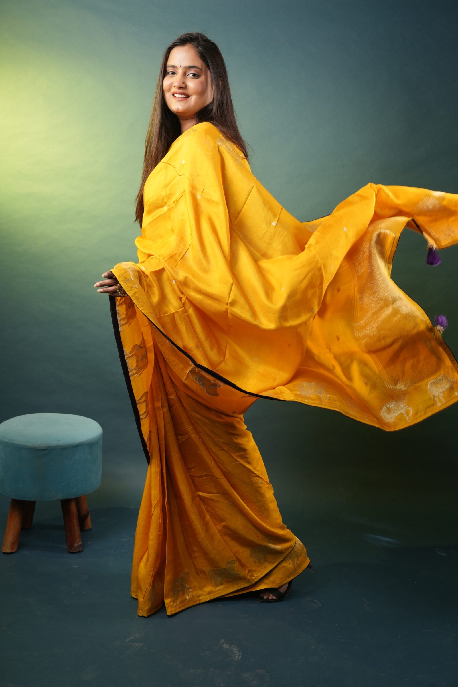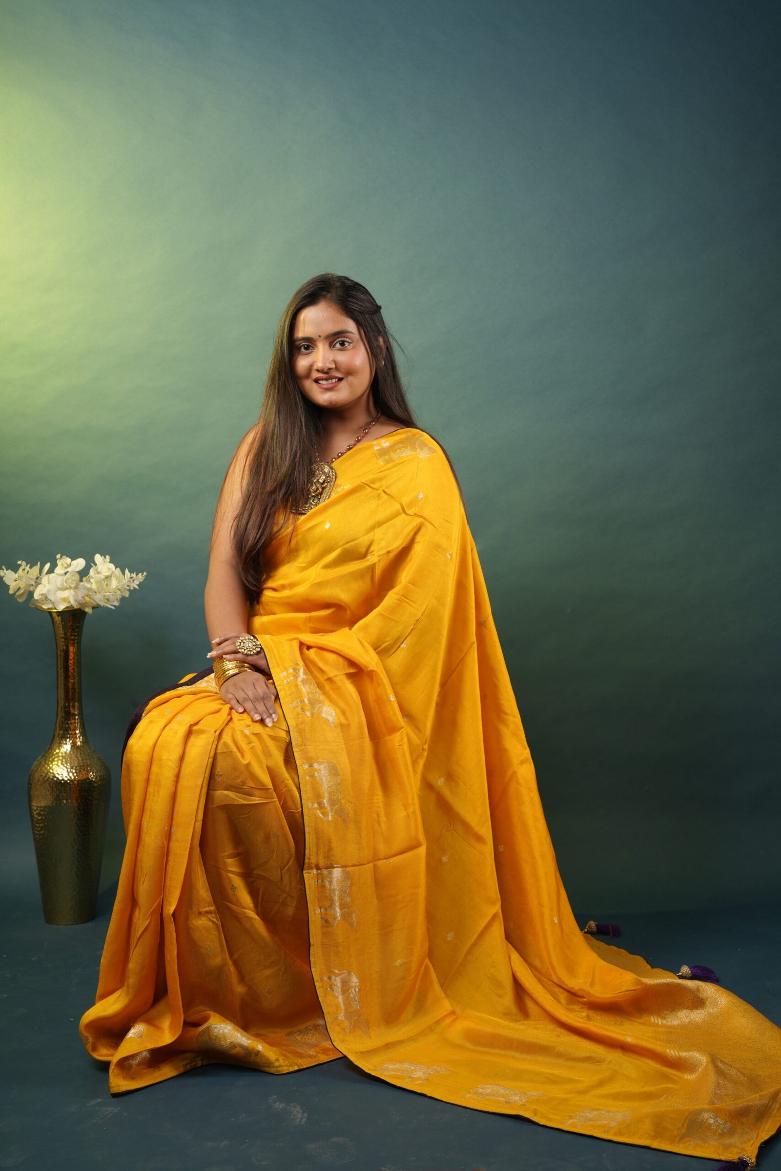 Brighten any occasion with this luminous crepe silk saree. The vibrant, sunshine yellow body flows beautifully, offering a lightweight and comfortable drape. The saree is elevated by a broad, shimmering gold Banarasi zari pallu, which adds a touch of festive grandeur.