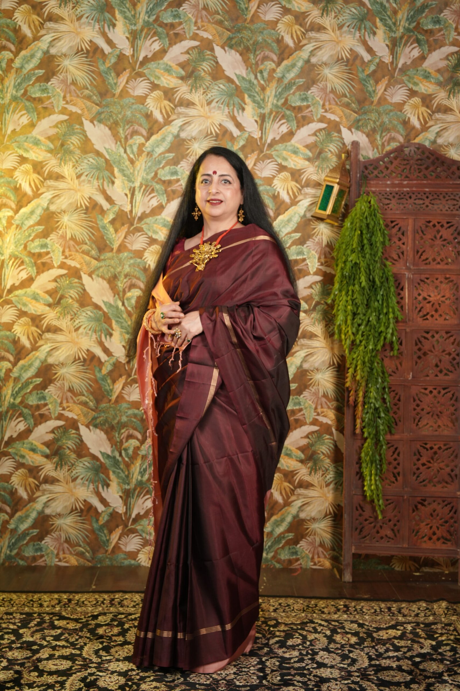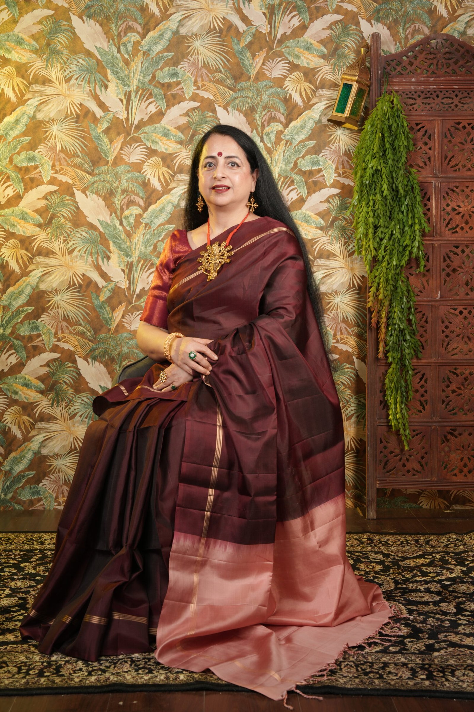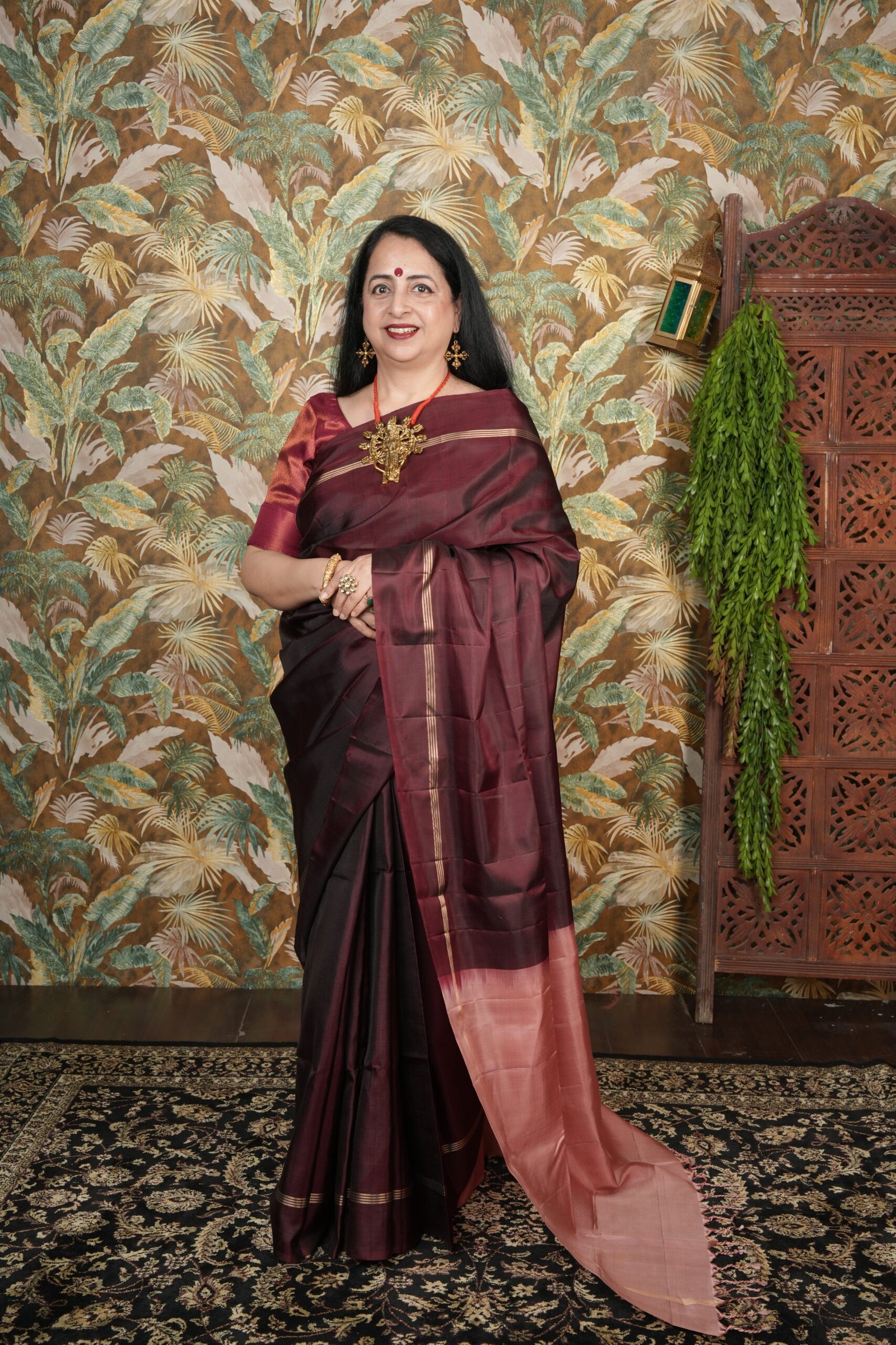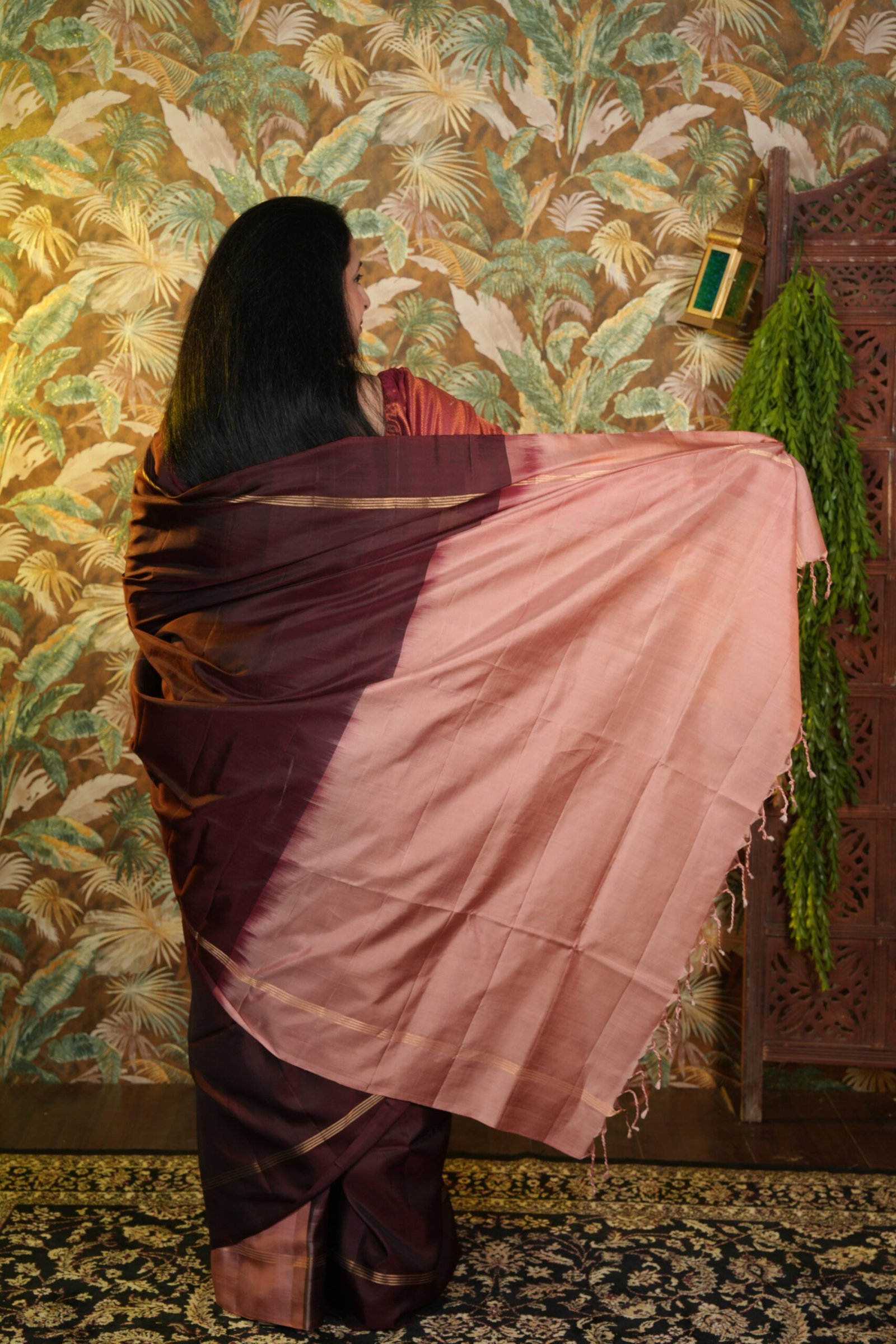 The body of the saree is a deep, luxurious wine-burgundy, a shade that speaks of royalty and sophistication. In a stunning dual-tone design, this rich hue melts into a soft, contrasting dusty rose pallu, creating a “half-and-half” effect that is both striking and elegant.