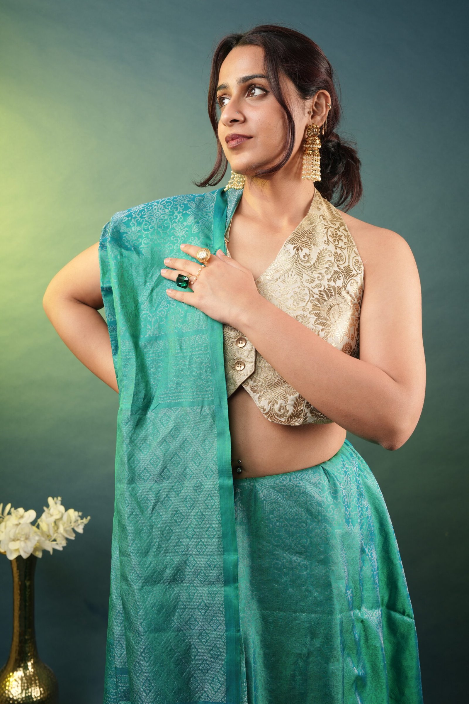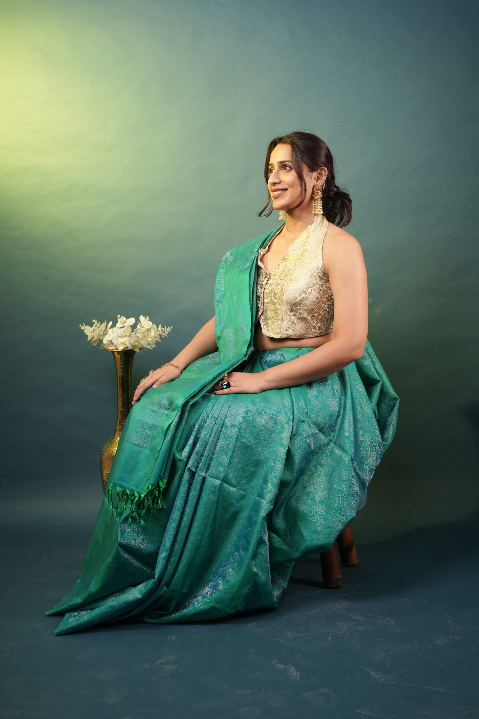 Drape yourself in this stunning Kanjivaram soft silk, glowing in a vibrant, dual-tone peacock green. The saree’s rich lustre and fluid drape are complemented by a subtle, all-over woven design, giving it a sophisticated and textured feel. Perfect for festive occasions and elegant evenings.