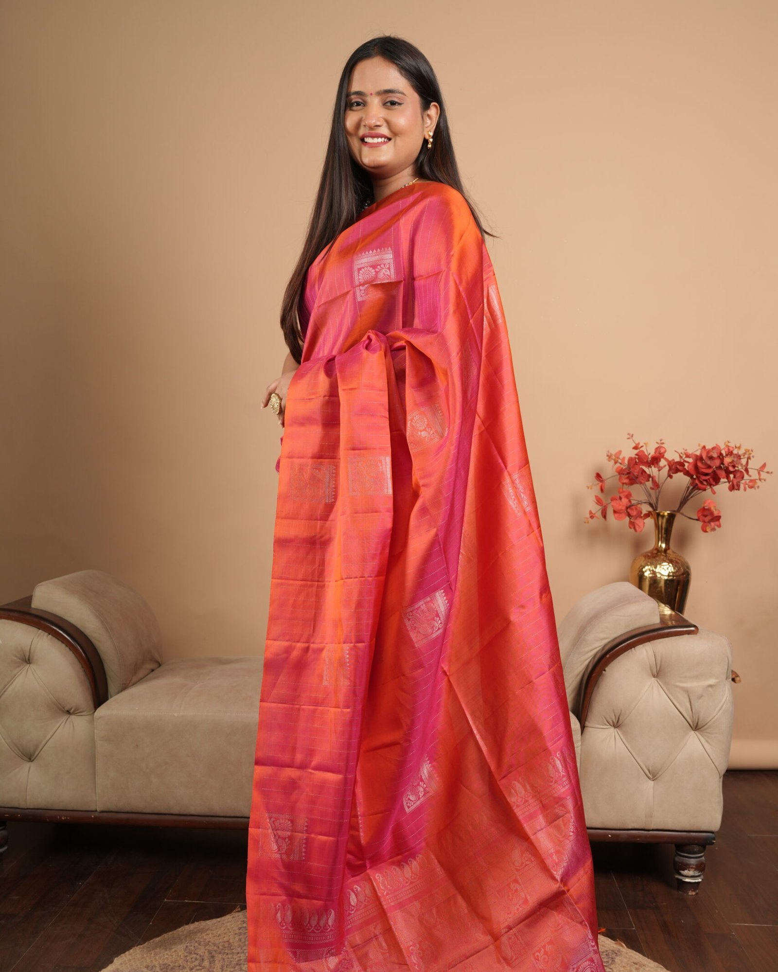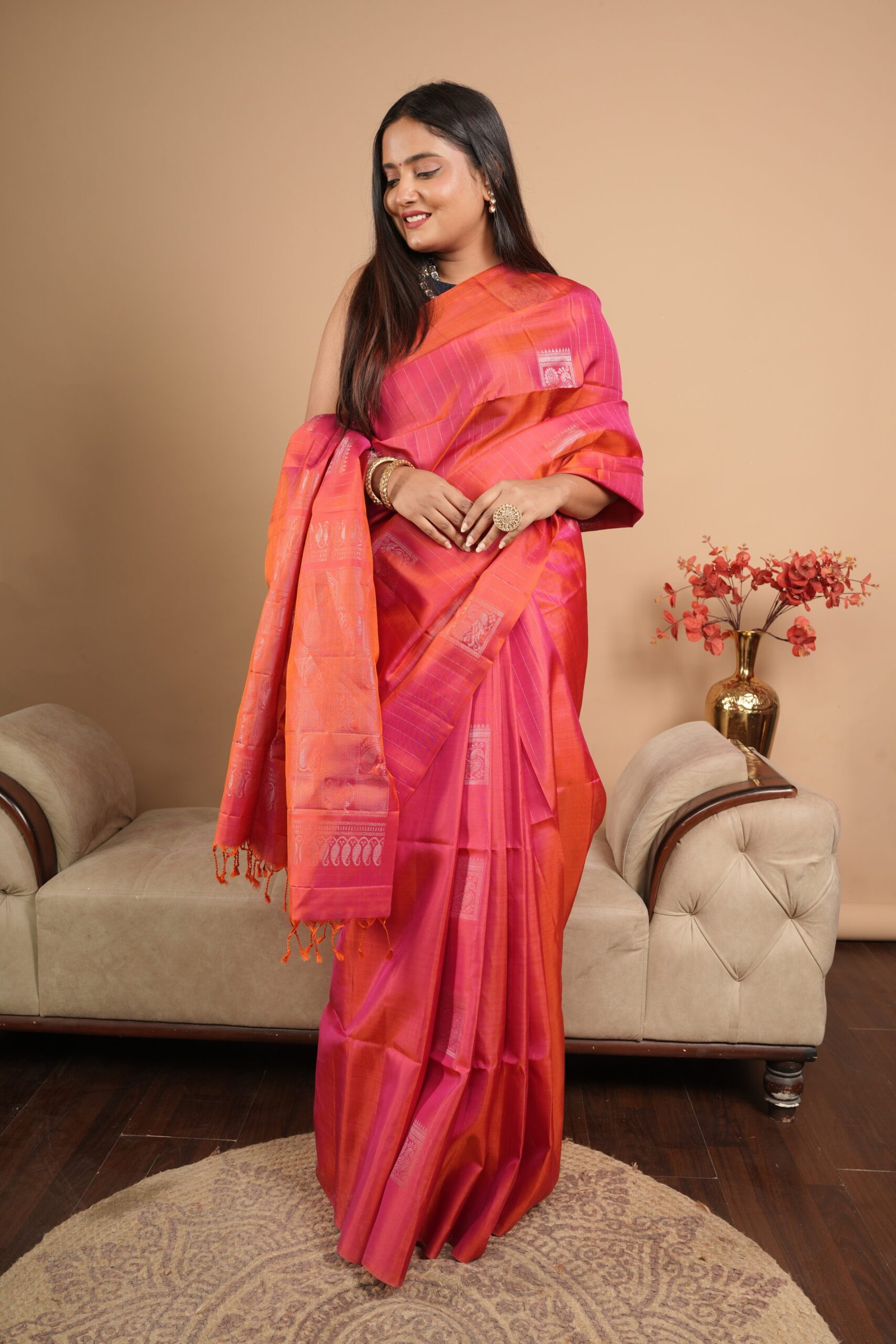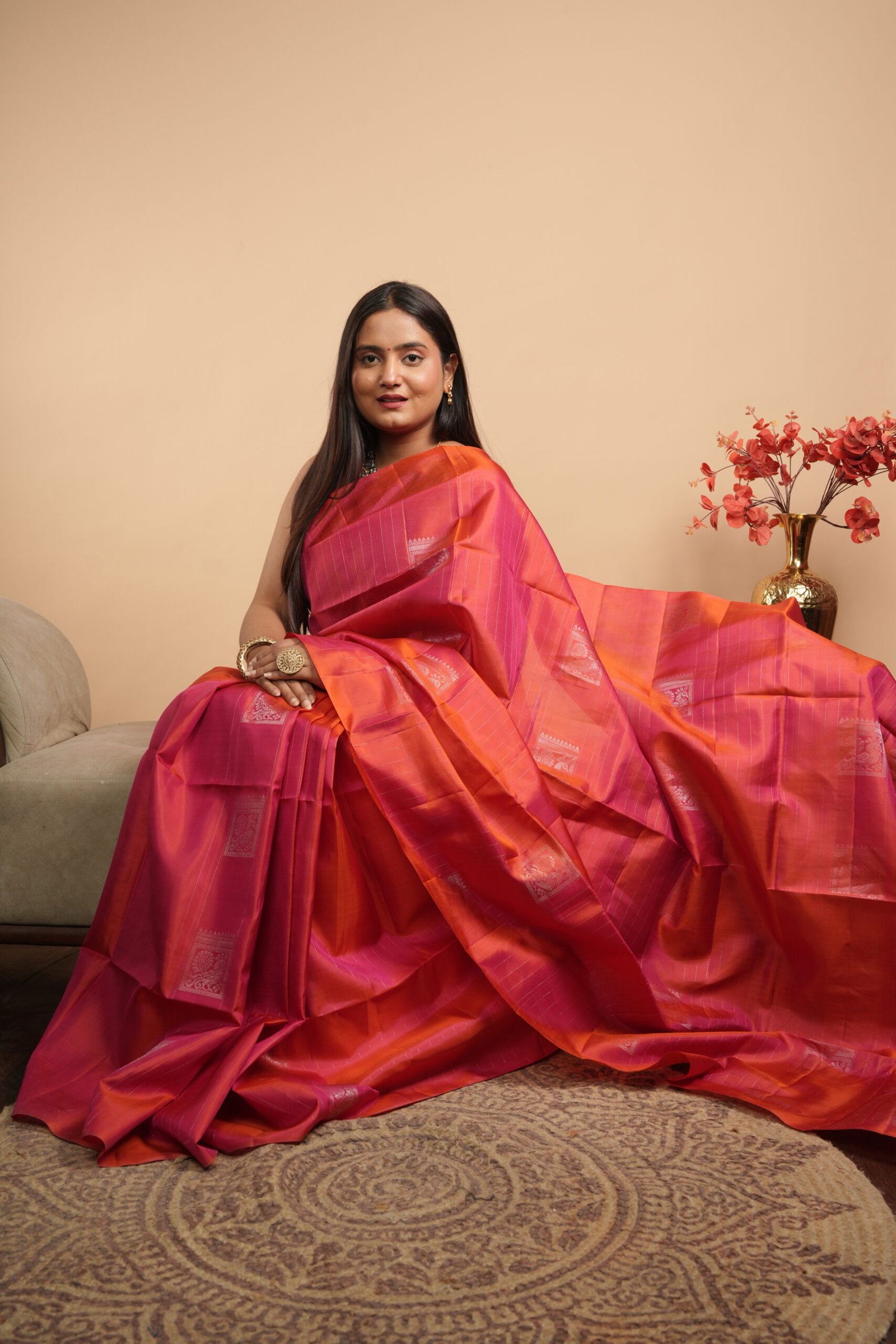Capture all eyes in this radiant Kanjivaram silk. The saree shimmers with a beautiful dual-tone effect, blending a bright, festive pink with a warm, glowing orange. Its exceptionally fluid drape makes it a dream to wear.