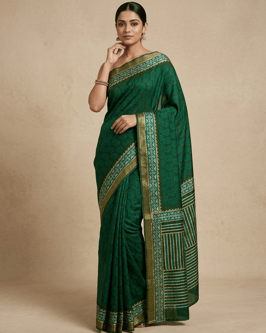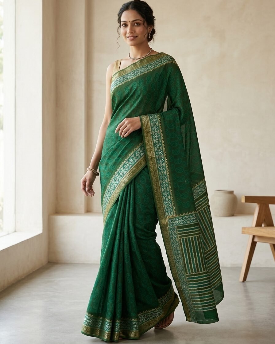 Exude timeless elegance with this beautifully crafted Maheshwari Cotton Saree, designed to reflect the richness of traditional Indian weaving. The deep emerald green hue adds a regal charm, making it a perfect choice for both subtle festive occasions and graceful everyday wear.