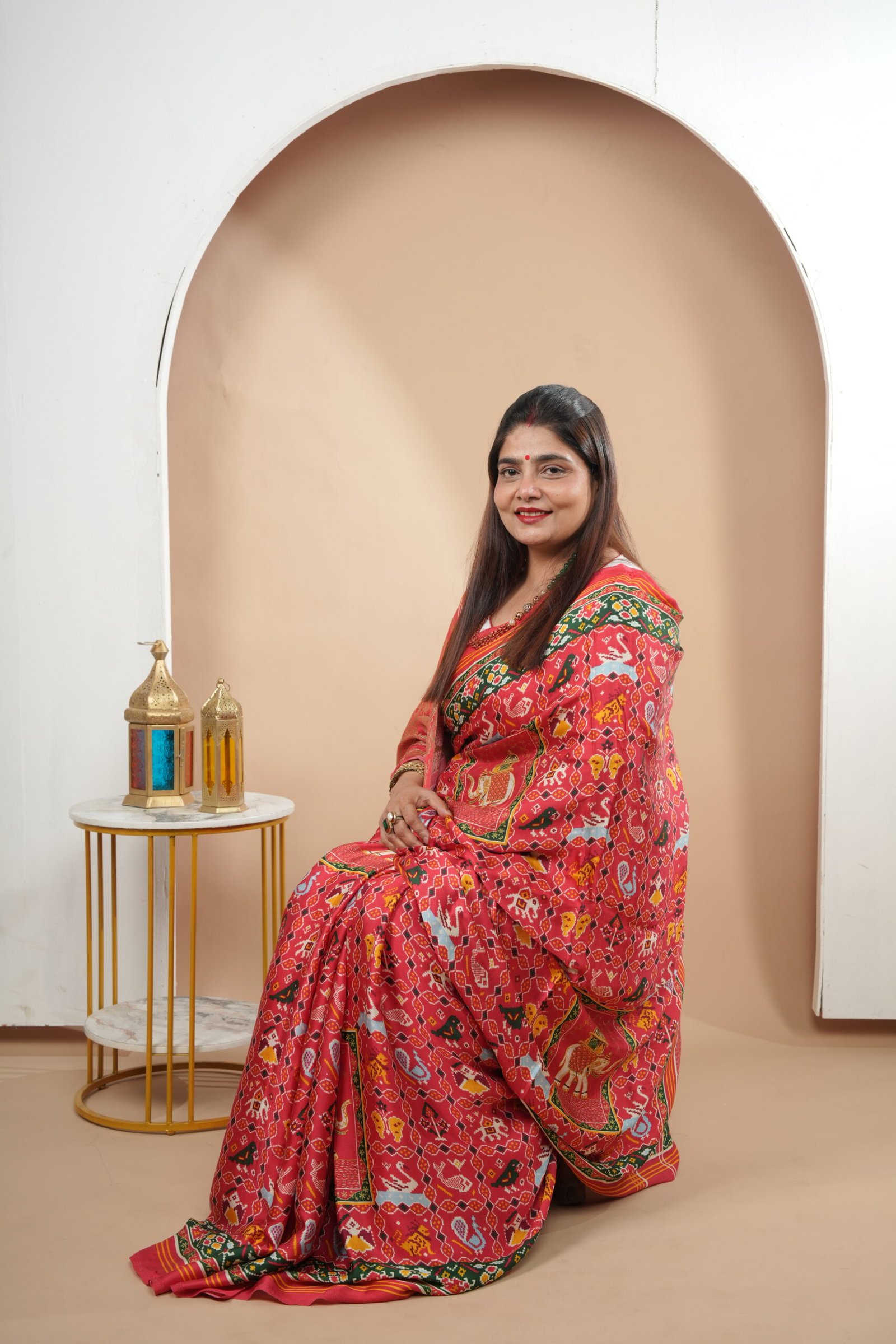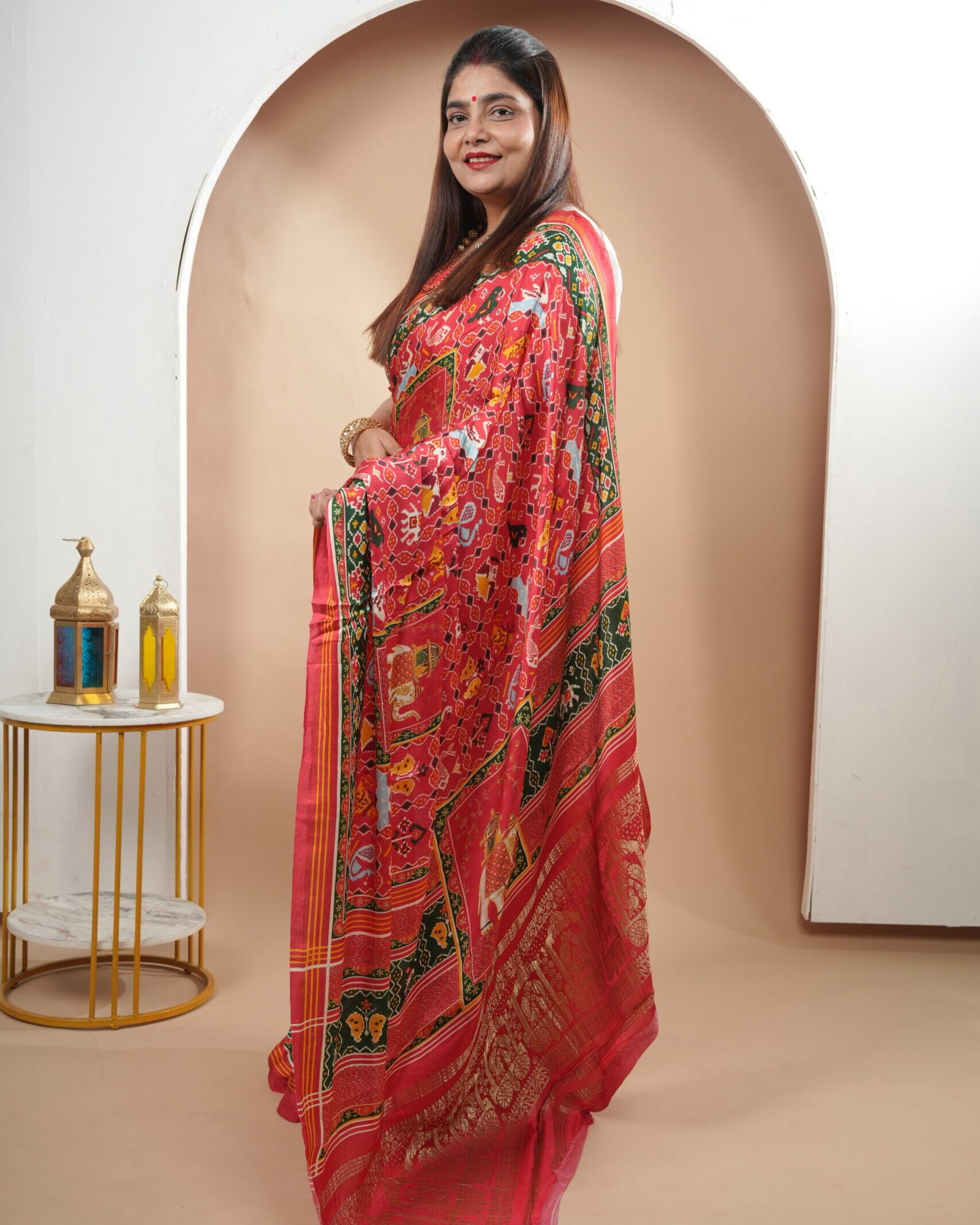 Celebrate tradition with this eye-catching Dola silk saree. The vibrant red body features an intricate, all-over Patola-style print, depicting elephants, figures, and floral motifs. A rich gold zari pallu and a contrasting dark green border complete this festive and lightweight saree.