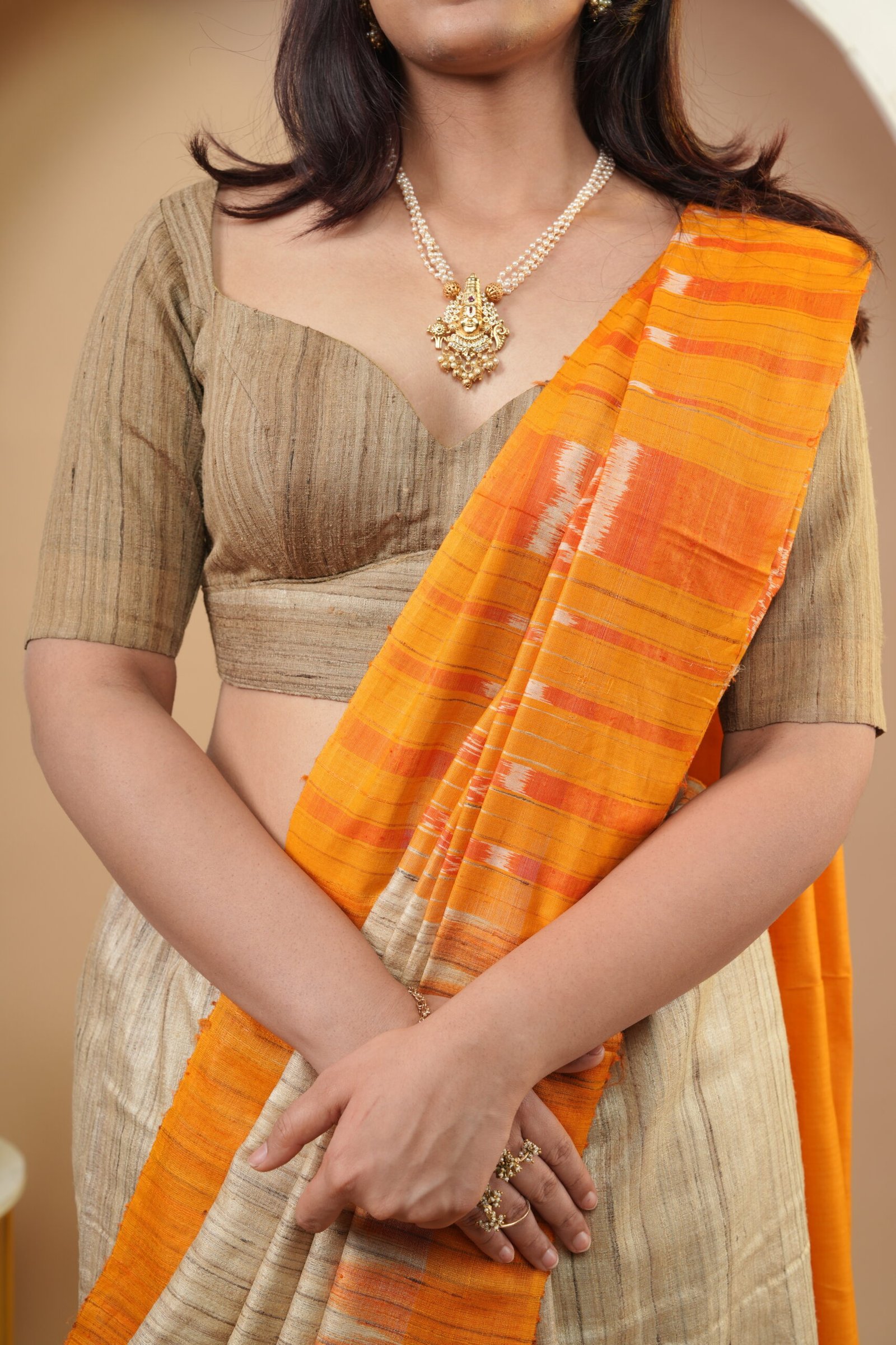 Experience raw, artisanal beauty with this Sambalpuri Tussar silk. The saree features a natural beige body, celebrated for its characteristic slubby texture. This earthy canvas is dramatically contrasted by a vibrant, mango-orange pallu, which is handwoven with traditional Sambalpuri Ikkat patterns.